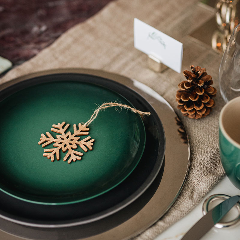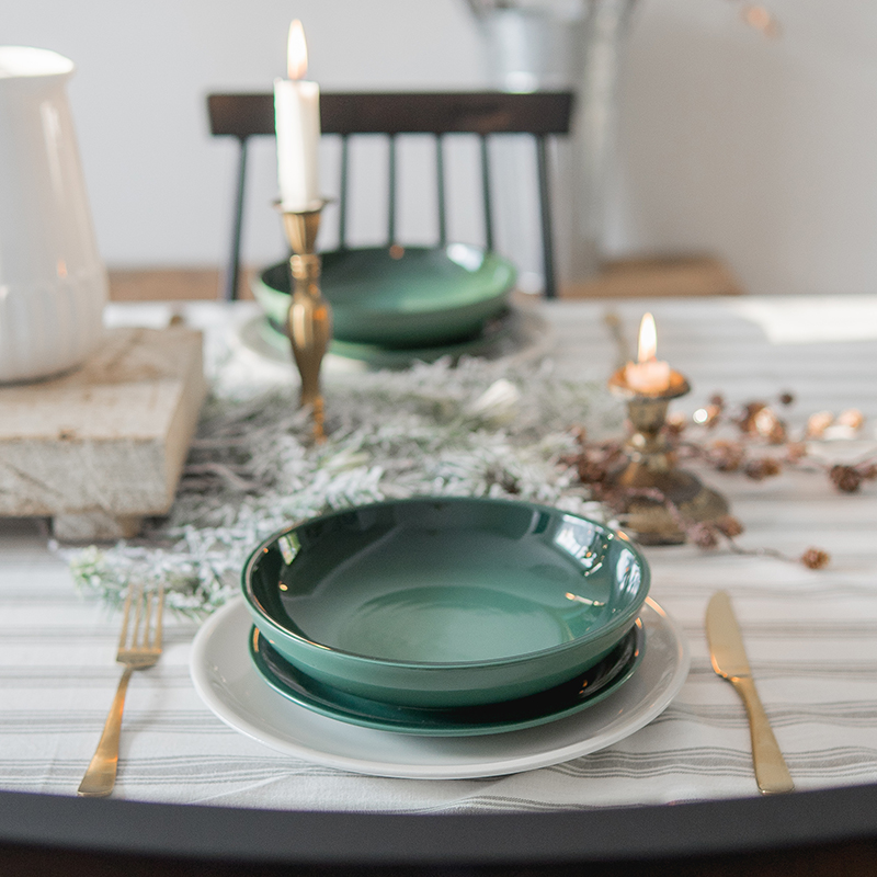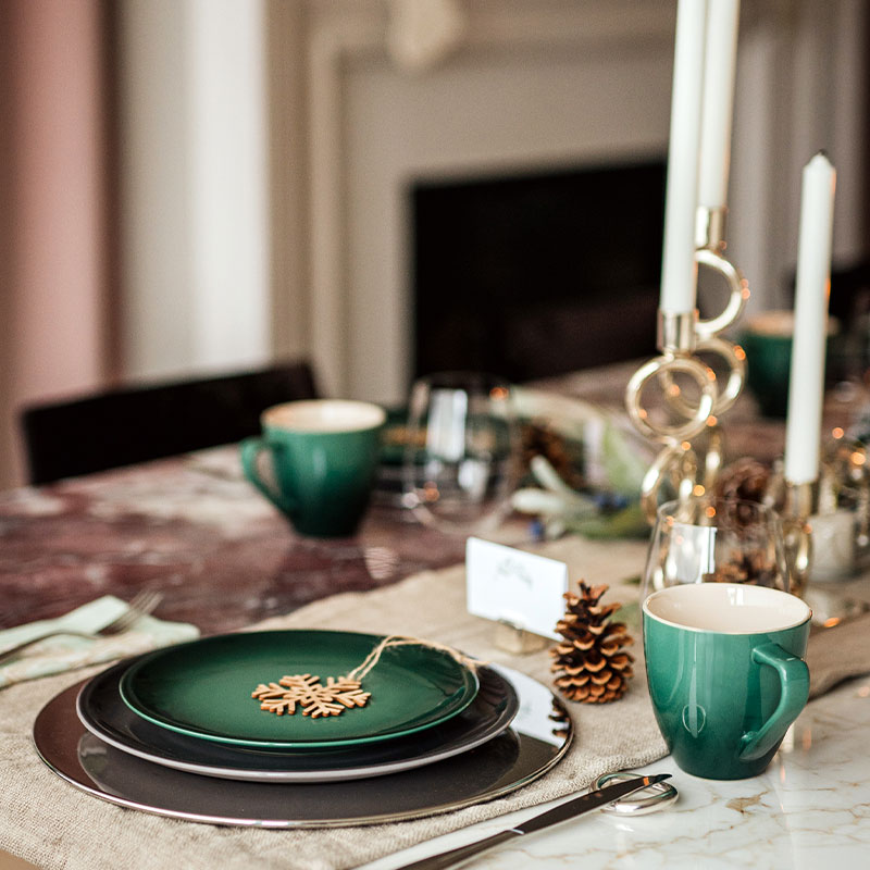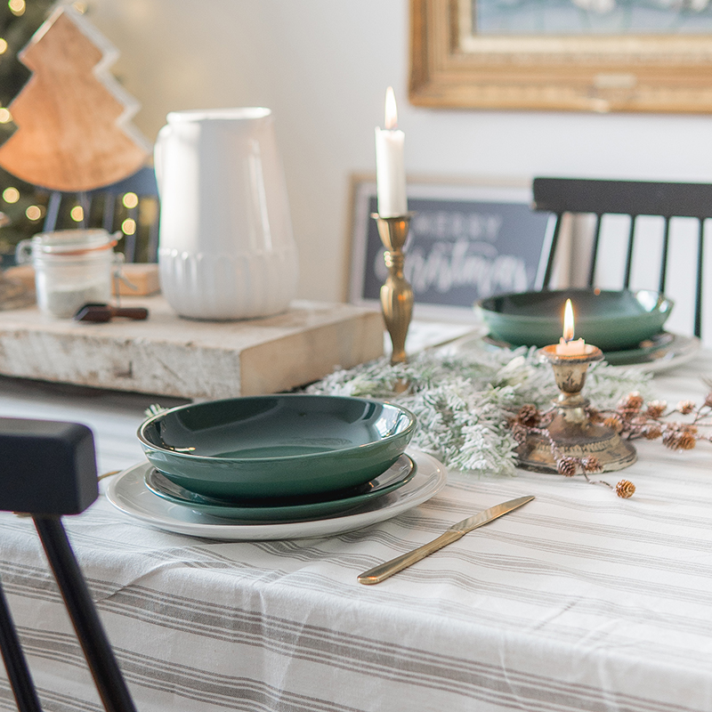 A classic pairing of green and white for the holidays is elevated with this table setting. Layered Classic dinnerware in alternating colours adds a unique twist. Add height with trendy tapered candle sticks to complete the look.