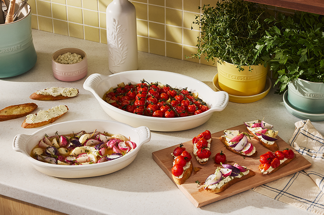 Place the cherry tomatoes in the 1.6 L Oval Au Gratin Dish, then add the olive oil, herbs, garlic, maple syrup and chili flakes. Mix gently and set aside.