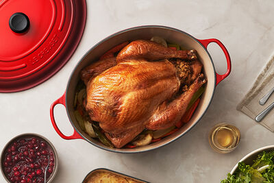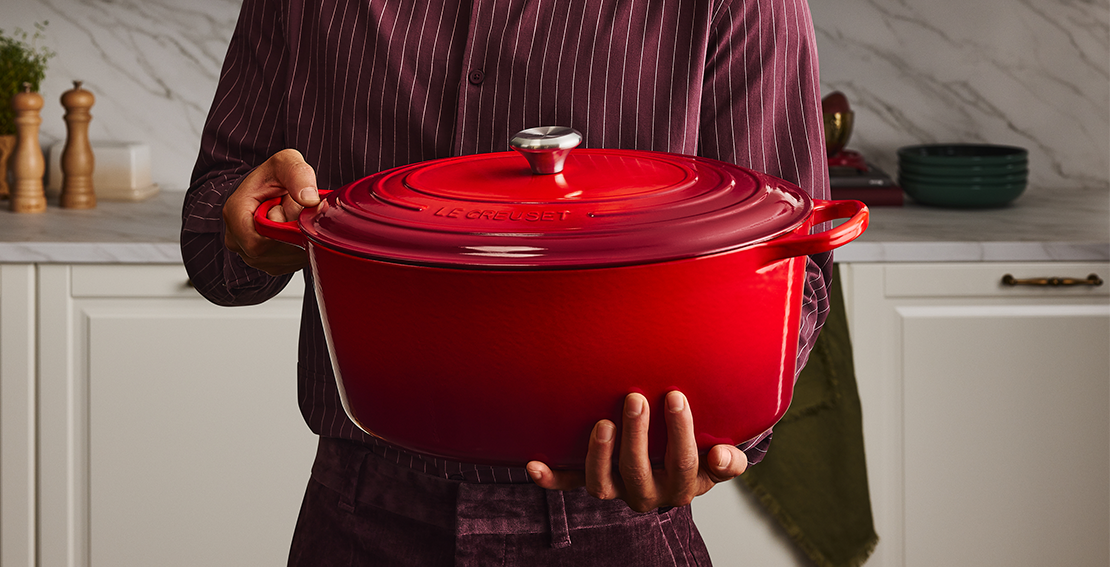 Inspired by oversized cast iron ovens dating back hundreds of years in Europe, the Goose Pot is the largest cooking vessel made by Le Creuset. With its deep sidewalls and secure lid, the Goose Pot locks in heat and moisture to fully cook even the largest stuffed birds.