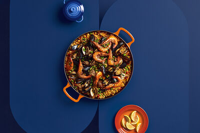 Crafted with enamelled cast iron, our Paella Pan provides a large surface area to keep the rice layer shallow and allow excess moisture to evaporate, creating a crispy golden socarrat. Its enamelled cast iron construction as well as the matte black enamel interior ensure superior heat retention, aiding in the development of the crust.