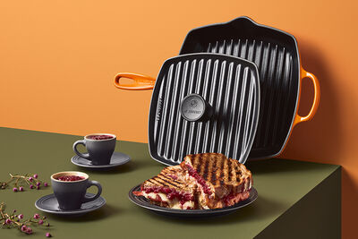Conçue en fonte émaillée durable, l’ensemble poêle-gril carrée et presse à panini chauffe simultanément le dessus et le dessous des sandwiches grillés. La presse, massive et rainurée, comprend un bouton pratique en résine phénolique qui permet une manipulation sécuritaire lorsque la cuisson est terminée.