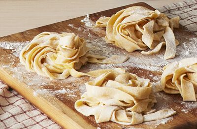 Remplir d'eau un faitout antiadhérent robuste pro, puis saler. Porter à ébullition. Cuire les pâtes fraîches pendant deux ou trois minutes, ou jusqu'à ce qu'elles soient al dente. Réserver 1/2 tasse (125 ml) d’eau de cuisson des pâtes. Égoutter les pâtes. Verser un filet d'huile et remuer pour éviter qu'elles ne collent. Réserver.